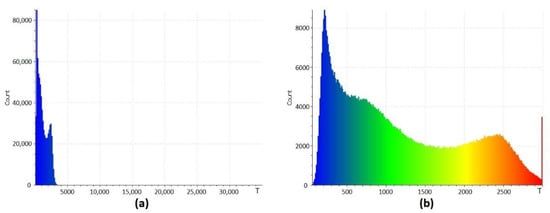 Moreover, in every cloud, there are extreme points excessively broadening the range of the T variable. A typical histogram, then, looks like that shown in Figure 2a—a vast majority of points fall within a relatively small range and only a small minority is outside this range. Values of T for individual points can be as high as T = 35,000 but there are so few such points that they are even not visible on the histogram. For this reason, winsdorizing is performed—the 99.9th percentile of data is arbitrarily found and this number is assigned to all points with T values above this percentile, see Figure 2b. This includes points on extremely smooth and planar surfaces, for which T was undefined (E3 for these points is 0 and T would, therefore, be +∞; in CloudCompare, such points would be marked NaN). The same is done for the 0.1th percentile and points lower than 0.1. This is the reason why the T = 3000 category is seemingly so overrepresented in Figure 2b—it is not because the value of T = 3000 is valid for so many points but because all points with T > 3000 were aggregated into this single value.