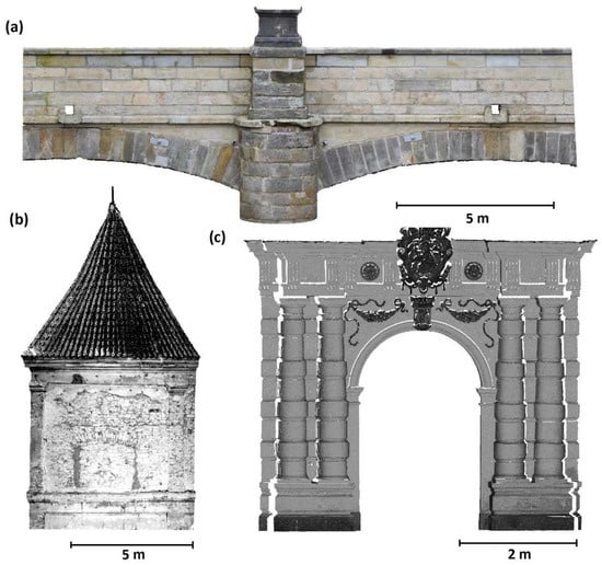 (a) Data 1—a part of a historic bridge; (b) Data 2—a part of a chapel falling into disrepair; (c) Data 3—a part of the entrance of the historic town hall.