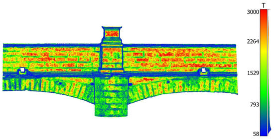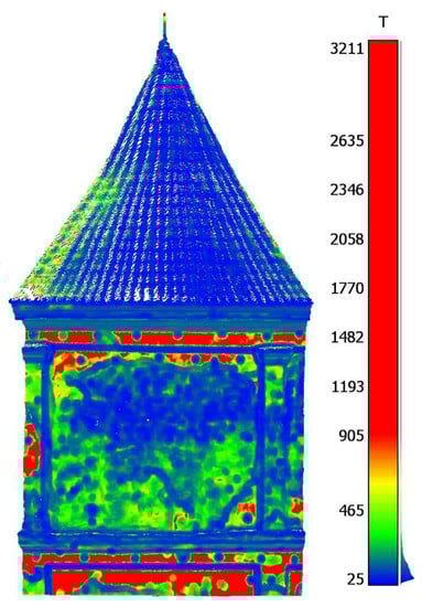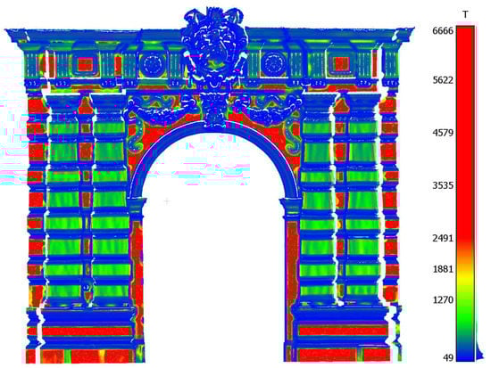 Compared to the previous two datasets, the character of Data 3 differs in the sense of having a lot of details with sharp edges, which calls for a higher quality of the resulting model (diluted point cloud). The original resolution of the point cloud is also higher than in the previous cloud (better than 0.005 m). The data includes highly detailed reliefs, such as the coat of arms in the middle and decorations of the columns, as well as practically flat surfaces on the feet of the columns or directly on the building walls. The areas covering the cylindrical parts of columns are slightly curved. Figure 10 shows the original point cloud colored according to the T variable. The E3 calculation on a standard laptop took 2.2 s, the transformation of E3 to T is practically immediate, and the dilution took 0.9 s.