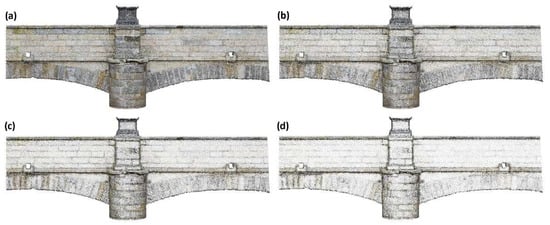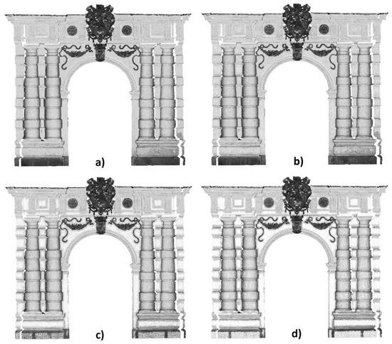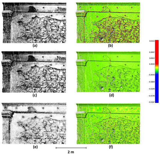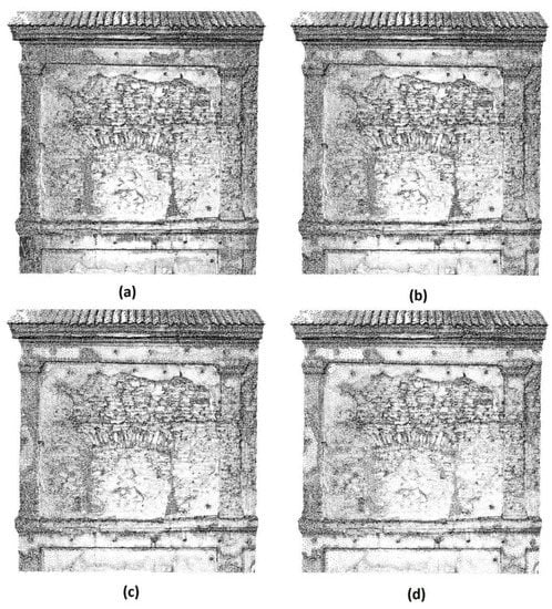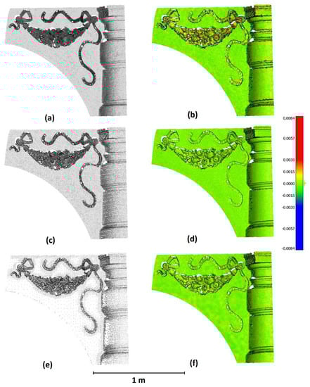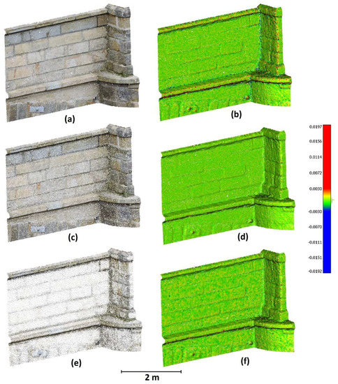 Comparing Figure 6d,f we can see the comparison of two clouds with the same maximum detail a (0.010 m). The progressively diluted cloud contains approx. a third of points compared to the uniform dilution, which represents a significant compression of the data. Although the number of points with a greater difference from the original cloud (red) is somewhat higher in the progressively diluted cloud, we can see that such erroneous points are dissipated, representing largely chinks and slight unevenness in the relatively flat areas of stone faces while the edges and details are preserved very well.