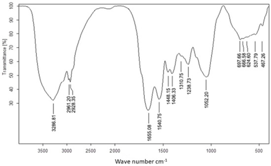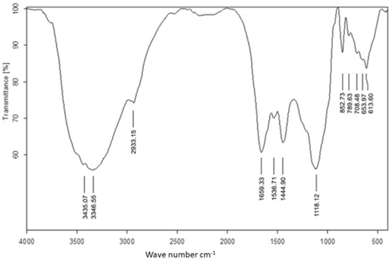 The use of FTIR for UseNPs can help identify potential active components which are responsible for the reduction of selenium ions and NP formation or those involved in stabilizing the NPs produced. The FTIR spectrum was recorded in the wavelength region from 613.5960 to 3435.0658 cm−1 (Figure 2), showing an absorption band at approximately 3435.0658 cm−1, which represented the hydroxyl group stretching vibration and indicated the presence of a hydroxyl functional group [50]. The highest absorption rate observed was at the 3346.5464 band. The shift in the spectral profile of U. lactuca extract to 3286.8142 cm−1 could be attributed to interactions between functional groups responsible for this band and USeNPs [51]. Similarly, the shift in the broad hydroxyl band could be explained by interactions between hydroxyl groups of polyphenols or sugars in the U. lactuca extract and the resulting USeNPs [50]. The occurrence of a unique peak at 2933.1506 cm−1, which represented the C-H alkenes stretching vibration, could indicate the involvement of hydrocarbon chains in the stabilization of USeNPs. These peaks also demonstrated the presence of a biopolymer, which was likely derived from algal cell walls and was linked to the SeNPs [52]. The bands at 1659.3297 cm−1 and 1536.7124 cm−1 represented the stretching vibration of the (NH) C=O group (Amide band II) for the N-H bending of the amines 1ry and 2ry, respectively, may suggest the involvement of amide groups (which could be from amino acids, peptides, or proteins). The band at 1444.9020 cm−1 was marked by N-H stretching vibrations found in protein amide linkages. Previous studies have indicated that these functional groups play a role in the stability/capping of SeNPs [53,54]. According to the literature, another absorption band at 1118.1212 cm−1 shows the superposition of in-plane C-H bending and C-N stretching vibrations of aliphatic amines, as well as the distinctive Se-O stretching vibration [55]. Some bending vibrations of the Se-O bond are highlighted from 852.7263 to 613.5960 cm−1.