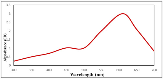 UV–Vis spectra studies confirmed that sodium selenite color changed from colorless to red (SeNPs) and that this color change was caused by SeNPs biosynthesis (Figure 3). As USeNPs increased, absorbance increased steadily from 2.6 to 3. The largest peak, however, occurred at 610 nm.