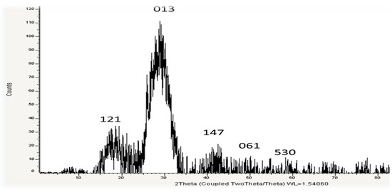 USeNPs phase composition and crystal structure were identified using the XRD techniques depicted in Figure 4. The sample’s XRD pattern indicates that it is nanocrystalline and closely resembles typical selenium powder, implying that selenium particles were formed. The formed NPs are selenium because at the 2θ angle in the range of 14–52.4° there is a specific diffraction peak, which is essentially consistent with the diffraction peak of JCPDS card number 65-1290. The pattern’s diffraction peak is very narrow, which is an indication that the phycosynthesized USeNPs are very small, crystalline, and have a poor amorphous character. The obtained XRD patterns showed the main peaks characteristic of crystalline SeNPs at the values of 19.01°, 30.8°, 43.5°, 28.5°, 30°, 39.42°, 50.069°, and 58.923° (Figure 4), respectively, corresponding to the crystal planes (121), (013), (147), (061), and (530). Scherrer’s equation calculated the average crystalline size of biogenic selenium nanostructures to be approximately 13.26 nm. Background noise was produced by the biological approach of SeNPs, which could result from the presence of additional bioactive compounds within the U. lactuca extract (Figure 4). The XRD pattern of the powder shows that post-annealing is not required to achieve the desired crystalline phase [30].