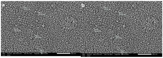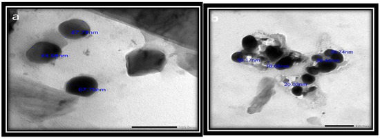 The physical and chemical properties of the synthesized SeNPs, such as their crystalline structure, shape, size dispersion, and surface condition, have been established to determine their suitability [56]. The results revealed that the synthesized SeNPs ranged in size from 18.65 to 67.79 nm and had smooth spherical and semispherical shapes (Figure 5a,b). These results agree with those of Vikneshan et al. [15] and Basant [30], who synthesized SeNPs from U. lactuca and Spirulina platensis extracts, respectively. Using TEM, they discovered that the morphology of SeNPs was smooth, spherical or ball-shaped, and uniformly distributed.