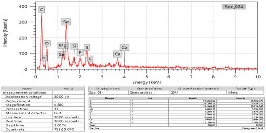 The NP size and form were evaluated using a scanning electron microscope (JSM 6490 LV, JEOL, Ltd., Tokyo, Japan). Samples were put onto double-sided carbon tape, allowed to air dry, and then photographed at various magnifications. The sizes were measured using various magnifications between 15,000 and 35,000 nm, as well as voltages between 20 and 30 kV for scanning. The same instrument was used to conduct an Energy Dispersive X-ray (EDX) study of elemental SeNPs between 0 and 12 keV [35].
