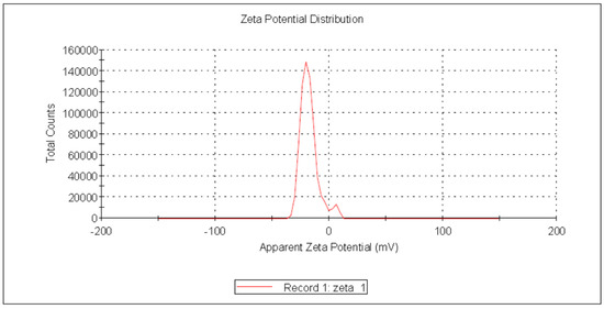 Zeta potential (ζ) reflects an estimate of the electric double layer formed in the solution by the surrounding ions rather than the actual charge on each molecule. Due to inter-particle electrostatic repulsion, NPs with values ranging from +30 mV to −30 mV exhibit high degrees of stability [57]. The negative charge of the produced USeNPs was validated, indicating that the SeNPs were more stable without aggregation. In the current study, Figure 8 shows that the zeta potential was charged with −19.0 ± 6.17 mV, the peak contained 94.9% of the area, and the zeta deviation was 4.38 ± 3.29 mV, with 0.0229 mS/cm conductivity.