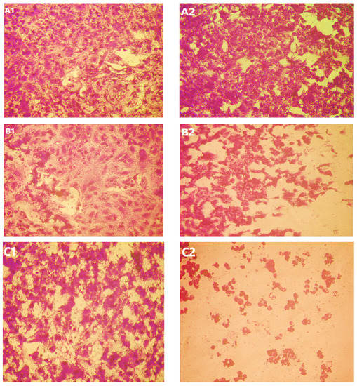 Effect of USeNPS on normal Vero cell line (control1,A1,B1,C1) and HepG2 cell line (control2,A2,B2,C2). (A1,A2) at concentration 125 µg/mL, (B1,B2) at concentration 250 µg/mL and (C1,C2) at concentration 500 µg/mL.