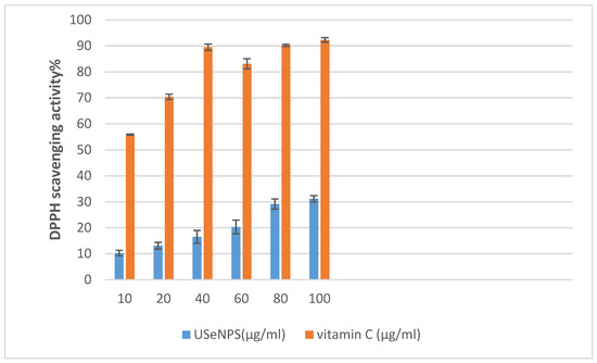 The effect of different concentrations of USeNPS on DPPH radical scavenging activity with (IC50) 158.02 ± 0.07 and 4.48 ± 0.01 for USeNPS and vit. C (reference drug), respectively.
