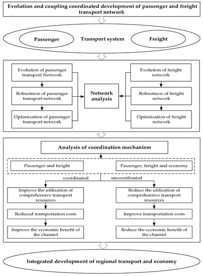In view of this, this paper constructs a comprehensive network structure analysis model to discuss the evolution and coupling and the coordinated development of the passenger transportation and logistics network of the New Western Land-Sea Corridor. According to the four important time turning points in the development process of western China, the cross-sectional data of 2000, 2006, 2012, and 2018 are selected. It selects passenger volume and freight volume and uses a gravity model to measure the correlation strength of passenger and freight transportation and establishes the urban passenger and freight transport network. A disturbance model was used to analyze the variation of the resilience of passenger and freight transport networks and put forward the corresponding strengthening strategies. It uses the network growth method to optimize its passenger and freight network. Finally, the coupling coordination model is used to discuss the coordinated development of passenger transport and logistics in order to provide support for the construction of the comprehensive transportation system of the New Western Land-Sea Corridor and the development of regional development potential, so as to provide a certain reference for the implementation of the western development strategy in the new era. To show the contents of this study more clearly, the research framework of this paper is shown in Figure 1.
