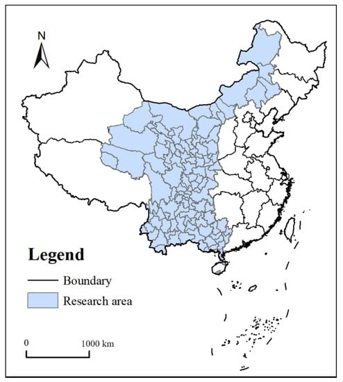 Since it is difficult to collect the data of specific prefecture-level cities in Xinjiang, Tibet and Hainan, the research scope of this paper only includes 113 prefecture-level cities in 12 regions of Chongqing, Guangxi, Guizhou, Gansu, Qinghai, Yunnan, Ningxia, Shaanxi, Sichuan, Inner Mongolia, Hainan, and Guangzhou. The research area is shown in Figure 2. The provincial and municipal administrative boundaries are derived from the Resource Environment Science and Data Center (https://www.resdc.cn, accessed on 16 March 2022).