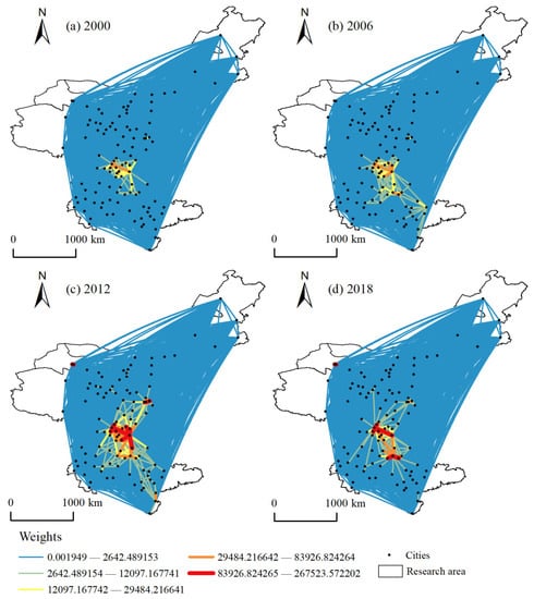 The evolution of the urban freight network in each year is shown in Figure 4. In 2000, the overall correlation strength of freight network was comparatively weak, and the spatial structure was formed with Chengdu and Chongqing as the centers and Xi’an as the sub-center gradually became prominent. In 2006, the entire network connection strength increased, mainly reflected in Chengdu-Chongqing urban agglomeration, Baotou, Ordos, Kunming, Qujing, Qianxinan, Liuzhou, Hezhou, Laibin, and other regions, treat Chengdu-Chongqing urban agglomeration as the center and formed the spatial pattern with Tongchuan, Xi’an, Weinan, Baotou, ordos, Kunming—Qujing—Qianxinan, and Liuzhou-Hezhou-Laibin as vice centers. In 2012, the network connection was further strengthened; higher values were mainly distributed in Chengdu, Chongqing, Xi’an, Deyang, Meishan, Nanning, Qinzhou, Fangchenggang, Baotou and Ordos; higher values were allocated in Dazhou, Nanchong, Luzhou, Neijiang, Kunming, Qujing, and Yuxi; and it shaped Chengdu-Chongqing urban agglomeration as the center and the network spatial pattern of Xi’an, Nanning, Kunming, and Ordos as sub-centers. In 2018, the correlation strength of Chongqing, Guiyang, Zunyi, Luzhou, Nanchong, Kunming, Nanning, and Yulin was further reinforced; the high-value areas shifted to Chongqing, Zunyi and Guiyang; and the sub high-value areas spread to Luzhou, Nanchong, Anshun, Qiannan, Guigang, Yulin, Kunming, and Yuxi. The high-value areas were mainly concentrated in Sichuan province, Guizhou province, Guangxi province, and Inner Mongolia, and they form a network space pattern with Chengdu-Chongqing urban agglomeration as the center and Guiyang, Xi’an, Kunming, Nanning, and Ordos as the sub-centers.