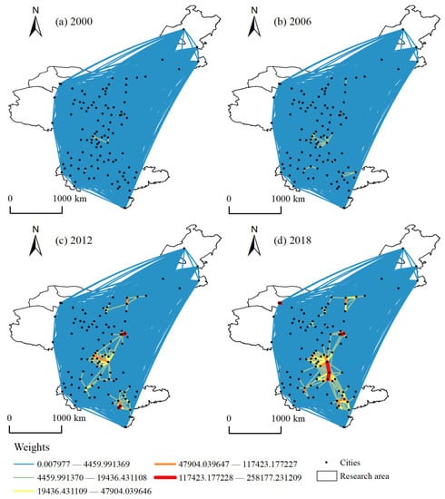Evolution of passenger transport network, (a) Passenger network in 2000, (b) Passenger network in 2006, (c) Passenger network in 2012, (d) Passenger network in 2018.