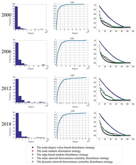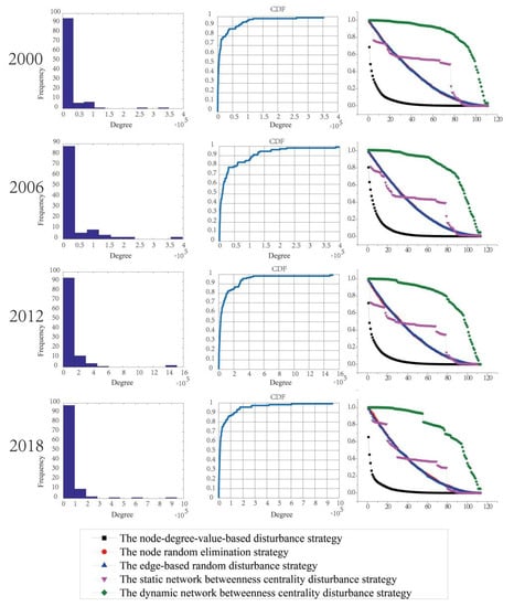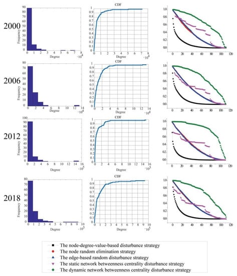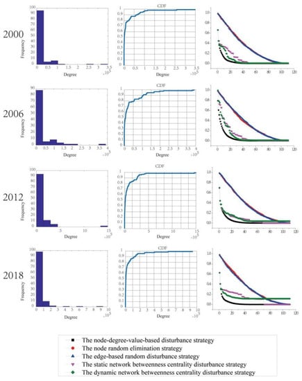 The accumulative degree distribution and network resilience of the whole urban freight transport network of 2000, 2006, 2012, and 2018 was then further analyzed (as shown in Figure 6). The network resilience of the whole freight transport network in different periods was dissimilar. With the simulation of the total network disturbance of urban passenger transport in four different years, the node degree value-based strategy has the greatest influence on the total network. When 10% of the nodes were removed, the network resilience decreased by about 75%. The same two random strategies are relatively stable; when 10% of the nodes were removed, the network efficiency only decreased by about 20%. Based on the static betweenness disturbance strategy of the whole freight transport network in 2000, when 13% of the nodes were removed, the network resilience only decreased by about 15%. If the nodes continue to be removed, the impact will be less than that of the two random disturbance strategies. However, when 75% of the nodes were removed, the network resilience decreased by about 95%, and the impact would be the same as that of the two random disturbance strategies. For the whole freight transport network in 2006, when 30% of the nodes were removed, the network resilience decreased by about 55%, and the impact was the same as that of the two random disturbance strategies. When the node removal was between 30% and 75%, the impact was less than that of the two random disturbance strategies. When the node removal was greater than 75%, the degree of influence was the same as that of the two random disturbance strategies. For the freight transport network in 2012, when 30% of the nodes were removed, the network resilience decreased by about 55%; when 30–73% of the nodes were removed, the impact degree was less than that of the two random disturbance strategies; when more than 73% nodes were removed, the impact was similar to the two random disturbance strategies. For 2018, when 40% of the nodes were removed, the network resilience decreased by about 65%; when 40–68% of the nodes were removed, the impact grade was less than that of the two random disturbance strategies; when more than 68% of the nodes were removed, the influence was nearly the same as that of the two random disturbance strategies. The dynamic betweenness disturbance strategy was relatively stable and had the least influence among the five strategies. Compared with the other three years, the freight transportation network had the least influence in 2012.