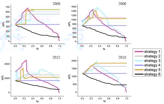 The passenger network has a strong network expansion ability. In the four-year period, strategy 6 was the best optimization strategy and strategy 1 had the second-best optimization effect while strategy 2, strategy 3, and strategy 5 had no optimization effect and strategy 4 always kept APL at its initial value. In 2000, when the number of network nodes increased by 70%, strategy 1 made the network APL equal to the initial value; strategy 6 made the APL decrease; and strategy 2, 3, and 5 made the network APL increase. In 2006, when the number of network nodes increased by 55%, strategy 1 made the network APL equal to the initial value, strategy 6 made the APL decrease, and strategy 2 and strategy 5 made the network APL increase. When the number of network nodes increased by 63%, strategy 3 made APL equal to the initial value. In 2012, when the number of network nodes increased by 60%, strategy 1 made the network APL equal to the initial value, strategy 6 made the APL decrease, and strategy 2 and strategy 5 made the network APL increase. In 2018, when the number of network nodes increased by 46%, strategy 1 made the network APL equal to the initial value, strategy 6 made the APL decrease, and strategy 2 and strategy 5 made the network APL increase. When the number of network nodes increased by 63%, strategy 3 made APL equal to the initial value.