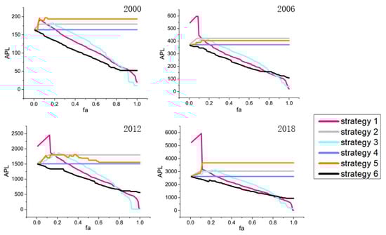 The freight network has a strong network expansion ability. Strategy 6 has the best optimization effect, strategy 1 has the second-best optimization effect, strategy 3 has the third-best optimization effect, strategy 2 and strategy 5 increase the network APL value, and strategy 4 keeps the network APL value at the initial value. In 2000, when the number of nodes increased by 20%, the APL value of strategy 1 was equal to the initial value; the APL value of strategy 6 was less than the initial value; and the APL values of strategies 2, 3, and 5 were all greater than the initial value. In 2006, when the number of network nodes increased by 22%, the APL value of strategy 1 was equal to the initial value; the APL value of strategy 6 was less than the initial value; and the APL values of strategy 2, 3, and 5 were all greater than the initial value. In 2012, when the number of nodes increased by 30%, the APL value of policy 1 was equal to the initial value; the APL value of policy 6 was less than the initial value; and the APL values of policies 2, 3, and 5 were all greater than the initial value. When the number of nodes increased by 25% in 2018, the APL value of strategy 1 was equal to the initial value; the APL value of strategy 6 was less than the initial value; and the APL values of strategies 2, 3, and 5 were all greater than the initial value.