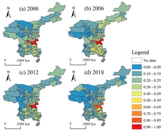The evolution of the urban passenger flow network in each year is shown in Figure 3. In 2000, the second highest value areas were located in Chengdu and Chongqing, while the higher value regions were located in Sichuan province, Xi’an, Guiyang, Zunyi, and other cities, forming a passenger flow network structure dominated by Southwest China. In 2006, areas like Luzhou, Nanchong, Guang’an, Guiyang, Qiannan, and Qiandongnan had stronger passenger flow network correlation strength, and the sub-high value region gradually expanded. Meanwhile, Guizhou and Guangxi province had stronger overall correlation strength and gradually formed a spatial pattern of passenger flow network with Chengdu-Chongqing urban agglomeration as the center and Xi’an and Guiyang as the sub-centers. In 2012, the correlation strength of Chengdu, Meishan, Luzhou, Nanchong, Guang’an, Chongqing, Xi’an, Zunyi, and other regions further enhanced; located in the high-value area, the second-highest value area migrated to Chengdu-Chongqing urban agglomeration, Central Guizhou urban agglomeration, Zhanjiang, and Haikou. The higher-value area gradually expanded, extending to Guanzhong urban agglomeration. In 2018, the main high value area was located in Chengdu, Chongqing, Guiyang, and the second-highest value was located in Chengdu-Chongqing urban agglomeration, Central Guizhou urban agglomeration, and Xi’an. A higher value is moving to Yunnan; further models show a passenger flow network spatial pattern with Chengdu, Chongqing, and Guiyang as the main centers and Chengdu-Chongqing urban agglomeration, Central Guizhou urban agglomeration, and Guanzhong urban agglomeration as the sub centers.