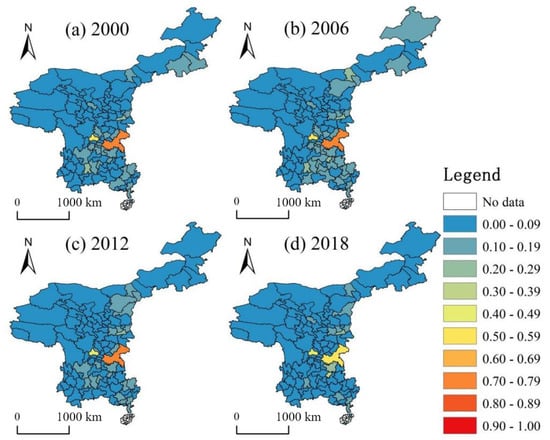 Coupling coordination degree of economy, logistics and passenger flow in four years, (a) Economy, logistics and passenger flow coupling coordination in 2000, (b) Economy, logistics and passenger flow coupling coordination in 2006, (c) Economy, logistics and passenger flow coupling coordination in 2012, (d) Economy, logistics and passenger flow coupling coordination in 2018.