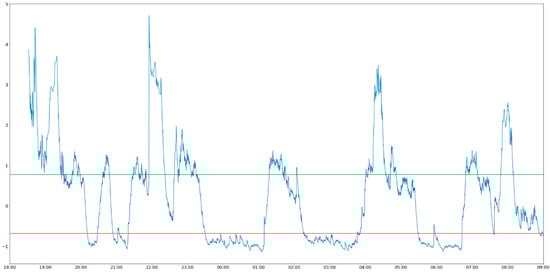 The activity analysis of the animals during the night period allows us to verify several periods of inactivity interspersed with periods of activity [16,17,18,19]. As an example, Figure 2 illustrates the activity diagram of the sheep wearing collar 2 between 6:00 p.m. on 6 December and 9:00 a.m. on 7 December.