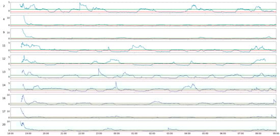 The joint analysis of the activity of the whole herd, illustrated in Figure 3, makes it possible for us to identify significant differences in the amplitude of the activity peaks between different sheep, and that these activity peaks do not occur at the same time. Ignoring the initial period until approximately 20:00, when the animals are probably still eating and the herd is stabilizing, the analysis presented in Figure 3 allows us to verify that individual periods of activity occur in a desynchronized way, with each animal getting up at its own time, while the others remain inactive.