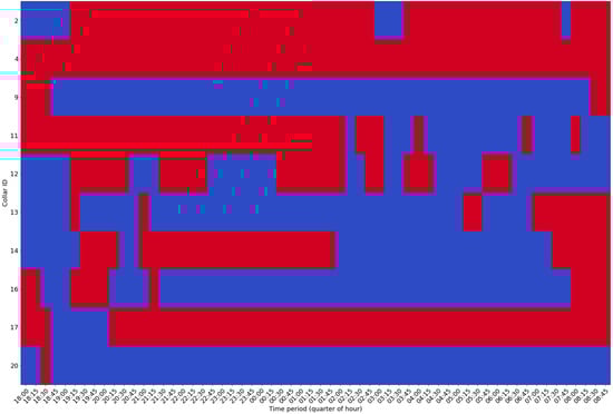 To identify the individual activity of each element of the herd, and to visually identify those moments, we processed the data that were used to generate Figure 3, aggregating the data every 15 min and deciding on the basis of the majority the status of each animal in each of the moments. More details of the processing algorithm can be obtained by examining the code shared in the repository. Each interval generated in the aggregation process, from each of the sheep, was then drawn, and the image presented in Figure 4 was created.