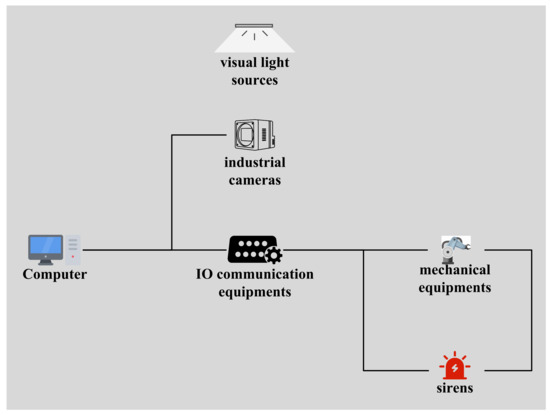 The hardware equipment of an appearance quality inspection system generally includes the main control computer, industrial camera, vision light source, IO communication device, and alarm [14,15], as shown in Figure 1.