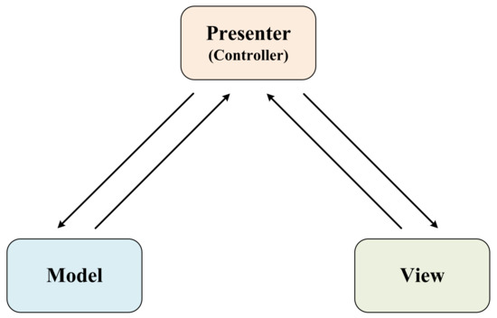 The MVP pattern [25] is an improvement of the MVC pattern. MVC (Model-View-Controller) is a design pattern for software [26]. The MVC pattern divides the software system into three core modules: the view module, the control module, and the data model module, which correspond to the V, C, and M in MVC. The relationship between the three is shown in Figure 2.