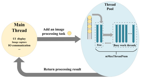 As shown in Figure 5, the main thread, which is the thread started by the main function, is only responsible for the basic work of the GUI display, image acquisition, and IO communication. The specific image-processing task is delivered to a worker sub-thread of the thread pool for processing and the result is returned to the main thread when finished. The thread pool is constructed by initializing a number of work sub-threads equal to mMaxThreadNum and preparing a task queue. By default, mMaxThreadNum = 8. In practical application scenarios, it can be reset to a suitable number according to the demand and performance of the computer.