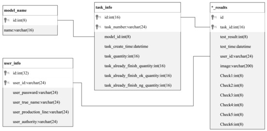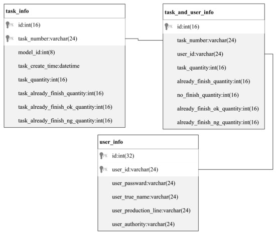 Task management is mainly to associate the detection model with the number of users and products (the number of detections) and determine a task uniquely identified by the “task_id”, as described in Section 3.6. The task management class mainly consists of a user information table, a task information table, and a task–user association information table. The internal relationships are shown in Figure 8.