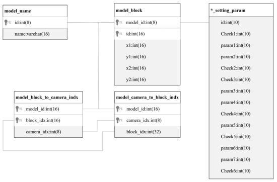 The inspection configuration mainly creates a new detection data model uniquely determined by the “model_id”. The model contains a series of configurations, as described in Section 3.6. The inspection configuration class consists of five tables: the inspection configuration name table(model_name), the local marker coordinates table for storing the detection location(model_block), the marker frame-associated camera index table(camera_to_model_block_indx), the camera index-associated marker frame table(model_block_to_camera_indx), and the detection parameters table(*_setting_param). The internal relationships are shown in Figure 7.