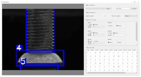 The inspection configuration information is stored in the database. The coordinates of the ROI are stored in the table “model_block” (see Appendix A Table A8 for an example). The association between the camera and the ROI marker box is stored in the tables “model_block_to_camera_indx” and “model_camera_to_block_indx”, and the model’s name and unique id are stored in “model_name”, as described in Appendix A Table A9, Table A10 and Table A11. The configuration information of the detection algorithm for the ROI is stored in a new table, the name of which is generated based on the entered model name. An example “bolttest_setting_param” is shown in Appendix A Table A12.