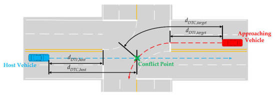 As mentioned in Section 1, many pieces of research have been carried out to develop the motion-planning algorithm for urban autonomous driving. Especially, motion planner for intersection passing has been studied recently. However, the conventional safety parameters, such as clearance (C), TTC, headway time, or time gap are hard to utilize for intersection driving scenarios, because the paths of the approaching vehicles are crossed inside the intersection, and the driving directions are opposite each other. In order to overcome the limitations of the conventional safety parameters, the safety parameters are defined as shown in Figure 2. dDTI means the remaining distance to enter the intersection. dDTC means the distance to the conflict point, which is defined as a cross point between driving routes for host and target vehicles. In this study, the summation of the dDTC,host and dDTC,target are used to define C. Based on the dDTI and dDTC, C, time to intersection (TTI), and TTC for intersection motion planner is calculated as follows: