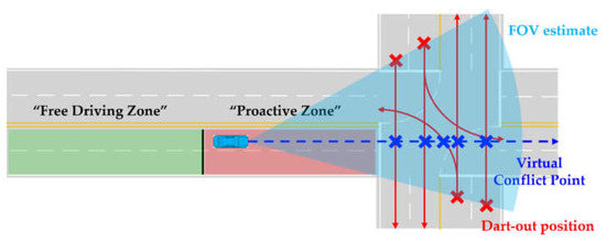 The first stage in deciding the target state for a proactive approach motion is predicting the crossing point with vehicles darting out from the boundary of the FOV estimate. The crossing point is named the ‘virtual conflict point’ in this study. This is because this point is not an actual conflict point with the detected target, but a possible conflict point. The estimation of sensor FOV is activated after an autonomous vehicle driving in the ‘free driving zone’ enters the ‘proactive zone’. The transition position from the free driving zone to the proactive zone is determined based on the nominal braking distance of the approaching autonomous vehicle. In this study, we use a −2.0 m/s2 as a nominal deceleration to determine the transition position. After an autonomous vehicle enters the proactive zone, FOV is estimated based on the size of the intersection region, the specification of the environment sensors, and the static obstacle map from the perception algorithm [43]. The purpose of the FOV estimation is to find the boundary of the blind spots. Thus, the static obstacle map, by using an occupancy grid, is the most important input of the target state decision. That is, if only the static obstacle map can be constructed, various types of environmental sensors can be used. For example, the FOV estimate can be defined as shown in Figure 4. Based on the FOV estimate and path information from the intersection map, all possible dart-out positions are selected, marked with a red cross in Figure 4. The driving paths from the darting out positions are depicted as red solid lines. The virtual conflict points are defined as intersection points between the driving paths of the autonomous vehicle and possible darting-out vehicles, which are shown in Figure 4 as a blue cross mark.