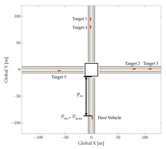 The proposed algorithm for approaching motion toward uncontrolled blind intersections was evaluated through the Monte Carlo simulation method. The same intersection used in the case study was utilized in this simulation. However, the numbers of target vehicles were increased from one to five to create a more complex driving situation as shown in Figure 8. The initial position, initial velocity, and maximum velocity of the host and target vehicles were randomly decided using Gaussian distribution as follows: