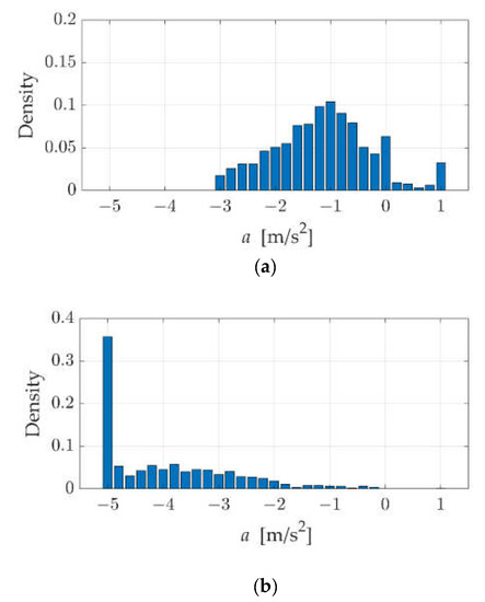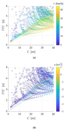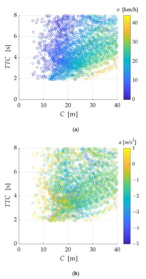 The Monte Carlo simulation was conducted 100 times for both algorithms. The Monte Carlo simulation results are summarized in Figure 9, Figure 10, Figure 11 and Figure 12. First, the safety performance of the proposed and base algorithm was analyzed using the TTC and C for intersection scenarios. Figure 9 shows the safety index distribution of the proposed algorithm in two TTC vs. C planes, each plane with colored marks in terms of velocity and acceleration. As can be seen in Figure 9, the proposed algorithm managed the risk caused by various driving situations while maintaining TTC and C above the minimum level, 2 s, and 5 m. In addition, Figure 9a shows that the velocity gradually decreased to zero velocity as the safety index approached the risky region. As shown in Figure 9b, this smooth velocity distribution was derived only using a mild acceleration. In the case of the base algorithm where the proactive motion planner was excluded, Figure 10 shows that a highly dangerous situation occurred even with maximum deceleration. In particular, maximum deceleration was used in most simulation trials because the autonomous vehicle entered the intersection with high velocity. Therefore, the proactive motion planner provided the appropriate approach motion, which improved safety only by using the nominal range of deceleration, as shown in Figure 11, which shows the histogram of the acceleration used.