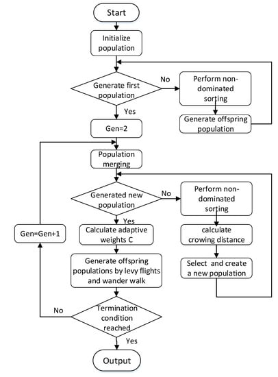 To overcome the disadvantages of slow convergence and falling into a local optimum [13] in the NSGA-II algorithm, we use an adaptive weight [14] to balance the global search and local search ability to accelerate the convergence speed, while using Levy flight and random walk strategies to improve the global and local search ability of the algorithm, respectively.