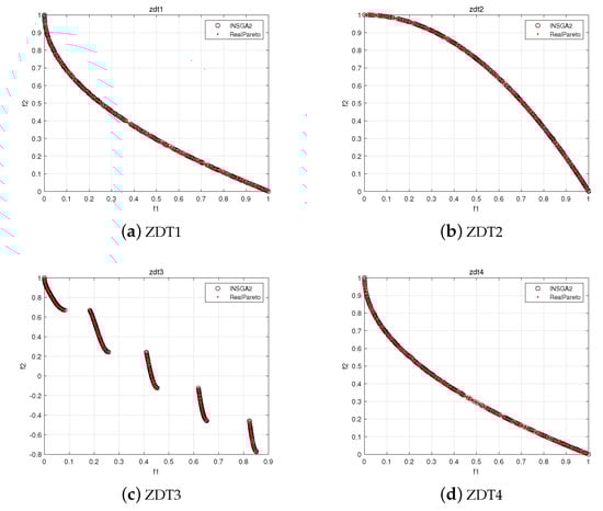 In order to prove the feasibility and validity of the improved NSGA-II algorithm proposed, the ZDT series of test functions [18] is selected to study the efficiency of the algorithm in solving multiple-objective optimization problems. These test functions are different, with different characteristics such as convex or concave, and their Pareto optimal frontier shapes are different, the specific descriptions and characteristics of the functions are shown in Table 1. Therefore, researchers often use these functions when conducting multi-objective optimization tests experiments. The simulation results are shown in Figure 2.