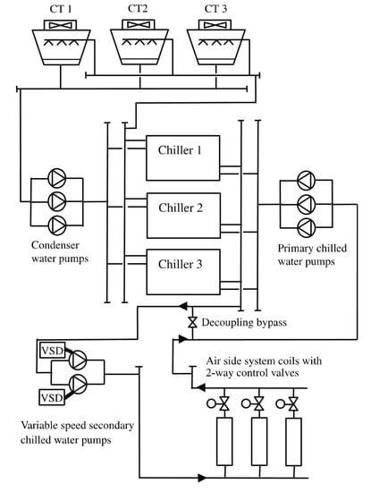 The proposed algorithm is applied to the chiller load distribution problem for the sake of verifying the effectiveness of the presented algorithm in practical project problems [22]. The cooling capacity required for the central air conditioning system is provided by the chilled water system, which includes chilled water pumps and a chiller system, as shown in Figure 4. Generally, the chiller system is operated jointly by multiple chillers with different refrigeration performance to manufacture chilled water, and the different refrigeration performance determines that the energy consumption of each chiller is also different. A multi-chiller system is composed of two or more chillers connected by parallel or tandem piping to a common distribution system. The chiller system can adjust its own load size so that each chiller operates at the optimal operating point.