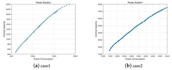 A chiller system with three chillers of 800 RT cooling capacity was selected for testing in Case 1 so as to confirm that the improved NSGA-II algorithm could be implemented to tackle the load distribution issues. To further verify the algorithm in solving the load distribution problem of parallel chillers, a cooling system which consists of six chillers was selected in Case 2, including four same chillers with a cooling capacity 1280 RT and 2 other chillers of 1250 RT. The purpose was to test whether the improved NSGA-II algorithm can search for optimal values in different multi-chiller systems. Through these two classical test cases, we verified the feasibility of the INSGA-II algorithm for solving practical problems. In the two test cases, the performance parameters of the chillers are shown in Table 6.