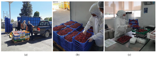 Harvested fresh fruit that enters the industry’s selection and quality control process. (a) Fruit reception. All harvested fresh fruit is received for the quality control process. (b) Fruit selection. Harvested fresh fruit is visually checked before choosing a random sample to be inspected. (c) Fruit sample. One kilogram of red raspberries is selected as a sample unit from an entire batch.