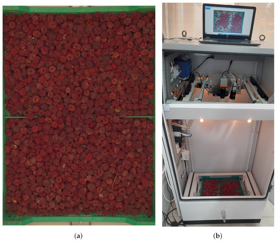 Raspberries and equipment. (a) RGB image of raspberries in a tray to be evaluated. Note that it is a sample unit of the fruit, which is uniformly distributed throughout the tray, avoiding overlap between the fruit as much as possible. (b) Patented device for the acquisition of the images. Observe that the tray is placed at the bottom of the device, at the top is the lighting system, and an external computer to store the images.