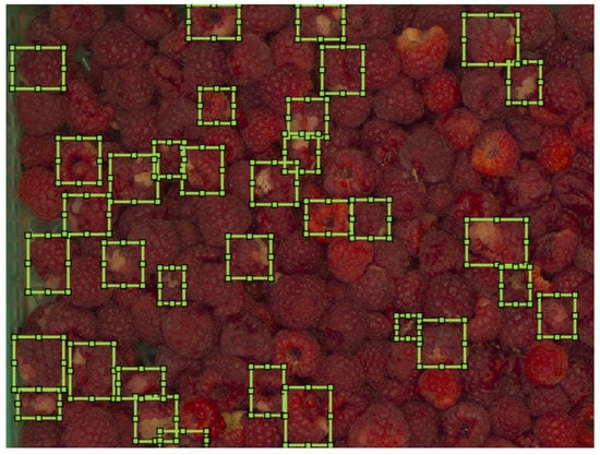 The database has four classes, two for diseases such as albinism and fungus rust; and two for defects such as over-ripeness and peduncle. During the industrial-quality process, a human expert manually tagged each class for each tray of red raspberries, and an image was taken simultaneously. This process is crucial because we have the human expert’s annotations that are the data’s ground truth to permit a better performance in the training and testing stages during the classification and detection phases. The importance of these labeled images is that instead of processing the whole image, the detection algorithm focuses on specific Regions of Interest (RoI): diseases, or defects. For this purpose, for each tray image of red raspberries, the detection algorithm will seek RoIs using the results of previously processed bounding boxes (frames). Note that these bounding boxes were validated with the annotations of the human expert of the industry, see Figure 4. Then, for each tray image of red raspberries, a bounding box was fitted to each raspberry disease or defect class as follows, albinism 786 labels, fungus rust 164 labels, over-ripeness 115 labels, and peduncle 244 labels.