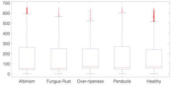 In this section, classification performance results using the three well-known methodologies are exposed, see Figure 8, Figure 9 and Figure 10. Table 4 shows the classification performance metric under 100 iterations of these three methodologies studied, namely recall, false positive rate, and accuracy through Equations (20)–(22), respectively. Please note that this classification performance metric is directly related to the Receiver operating characteristic (ROC) curve, which is an output performance of the learning system. Remember that the database has 786 albinism disease labels, 164 fungus rust disease labels, 115 over-ripeness defect labels, and 244 peduncle defect labels.