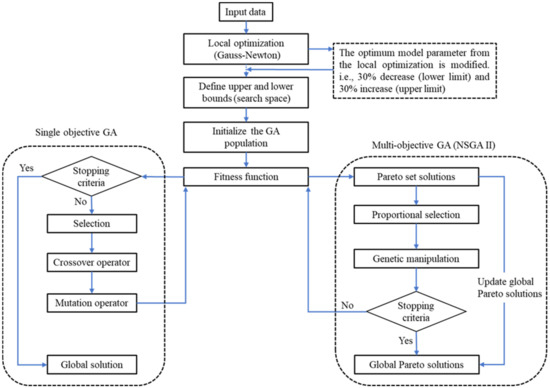 Notice that for the multi-objective (MOO) algorithm in Equation (14), the individual misfits are not added together but are simply concatenated to make a two-column matrix of the misfits. In addition, selecting the number of populations and generations is important to improve the model resolution in the CGO algorithm for both methods. Conventionally, the population size of 50 is recommended for the GA, with the number of decision variables less than or equal to five. Otherwise, 200 populations should be used when the decision variable is greater than five. The CGO algorithm is terminated when the average change in the spread of Pareto solutions is less than the function tolerance (i.e., 1 × 10−4 for multi-objective optimization, MOO) and the specified number of generations (i.e., for single objective optimization, SOO).