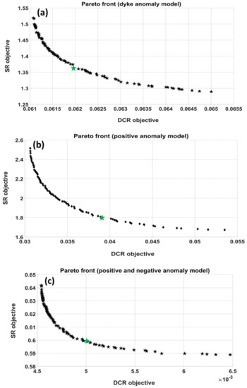 Plots of the Pareto fronts showing the compromise solution (green star shape) for (a) a dyke anomaly model, (b) a positive anomaly model, and (c) positive and negative anomalies model.