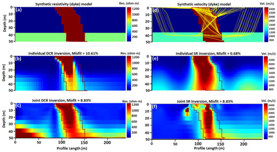 Dyke anomaly model inversion using local optimization method; (a) synthetic dc-resistivity model, (b) individual inverted resistivity model, (c) joint inverted resistivity model, (d) synthetic velocity model and its ray path coverage, (e) individual inverted velocity model, (f) joint inverted velocity model. The dark red line is used to mark the anomaly boundary.