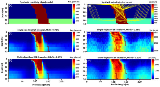 Dyke anomaly model inversion using combined optimization method; (a) synthetic dc-resistivity model, (b) single objective inverted resistivity model, (c) multi-objective inverted resistivity model, (d) synthetic velocity model and its ray path coverage, (e) single objective inverted velocity model, and (f) multi-objective inverted velocity model. The dark red line is used to mark the anomaly boundary.