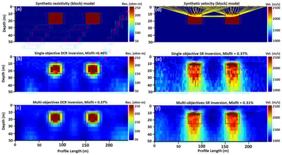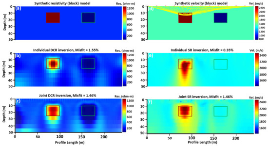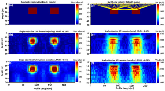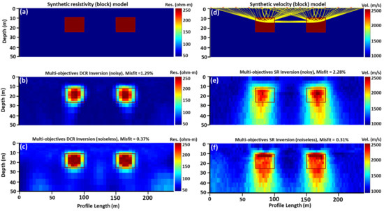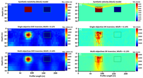 We examined the feasibility of the combined global optimization (CGO) algorithm by using synthetic earth models that simulated three near-surface scenarios. The first model comprised a dyke anomaly with a resistivity of 1250 ohm-m and a two-layered host environment with resistivities of 50 ohm-m and 250 ohm-m. Similarly, a dyke anomaly having a velocity of 2200 m/s and a two-layered host environment with layer velocities of 1000 m/s and 1500 m/s, respectively, was used for the corresponding velocity model (Figure 3a,d). The second model contained two blocks of positive anomalies, having a resistivity of 250 ohm-m and velocity of 2000 m/s, which was greater than the host environment as shown in Figure 3b,e. The third model was similar to the second one, with a higher parameter contrast (higher and lower than the host model anomalies) compared with the host rock, where the block parameters were set as 1250 ohm-m, 2500 m/s (Figure 3c,f). Generally, these models had the same profile length of 240 m in both methods, with a depth of 50 m in the DCR and 60 m in the SR methods. The DCR data were calculated for a setup with equally spaced 49 electrodes 5 m apart using the dipole–dipole (DD) array. The DD array was selected, since it had a fair penetration depth and a very good to excellent lateral resolution. The seismic survey layout was similar to the DCR profile, where we used 49 receivers with 5 m spacing and 13 sources with 20 m intervals in the SR forward calculations.