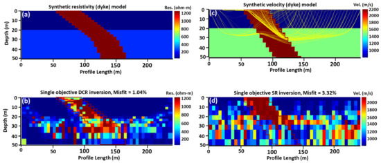 Dyke anomaly model inversion using the single objective global optimization method; (a) synthetic dc-resistivity model, (b) single object inverted resistivity model, (c) synthetic velocity model, and (d) single objective inverted velocity model. The dark red line is used to mark the anomaly boundary.