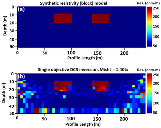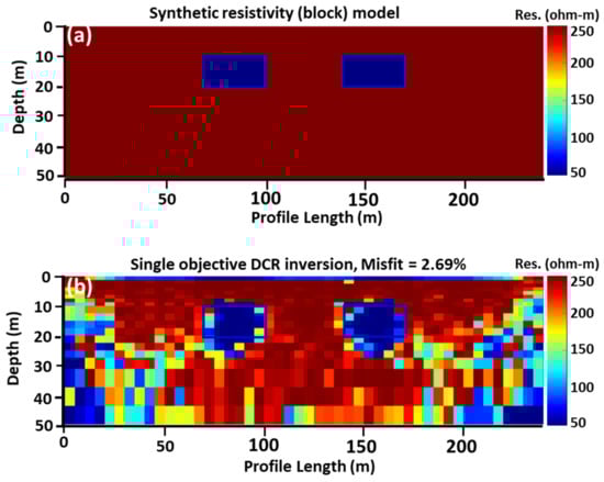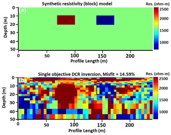 Similarly, local and global (hybrid) optimization has been applied to complement each other to subdue their shortcomings [35,36,37]. Most previous work has considered an objective function from a different perspective to perform joint inversion using a global optimization method, such as when using a local optimization algorithm. For instance, Schwarzback et al. [38] and Ayani et al. [39] considered the objective function for the inversion of electromagnetic data in two terms. First, they tried to minimize the data misfit and the roughness of the model at the same time. Akca et al. [40] applied a non-dominated sorting genetic algorithm in a joint 1D parametric inversion involving magnetic resonance and vertical electrical sounding.