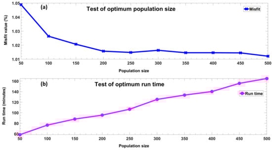 Effect of population size on DC-resistivity inversion using the genetic algorithm; (a) test of optimum population size that produces the most significant misfit and (b) test of optimum run time with respect to population size.